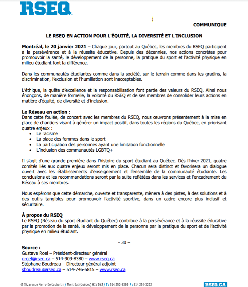 En novembre dernier, deux étudiantes de l’Université Concordia avaient interpellé le RSEQ sur les réseaux sociaux à propos de ce qu’elles considéraient comme un manque de leadership dans le dossier de la discrimination. Je m’étais également permis de poser des questions à ce sujet au nouveau président du conseil d’administration David Heurtel nommé en octobre.