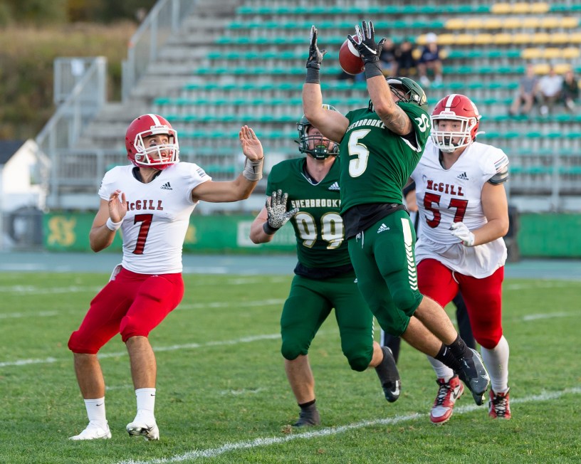 7- Le moment clé qui a fait basculer la rencontre est survenu au milieu du 4e quart quand Jean-Philippe Hudon, l’ancien secondeur de McGill maintenant avec Sherbrooke, a intercepté une passe déviée à la ligne de mêlée alors que les Redbirds étaient profondément dans leur territoire. Sherbrooke a repris possession du ballon au 25 de ses adversaires et la première passe tentée par Robichaud a été interceptée à son tour par Ryan McNally, mais une punition signalée à Costa Papanikolau pour contact illégal sur un receveur situé de l’autre côté du jeu a ramené tout le monde au 15 de McGill. Et deux jeux plus tard, les arbitres ont signalé un hors-jeu sur ce même Papanikolau alors que son coéquipier Benjamin Carré rabattait une passe sur un 2e essai. Robichaud n’a pas raté sa quatrième tentative en rejoignant Emilio Jaimes Leclair sur 10 verges dans la zone des buts.
