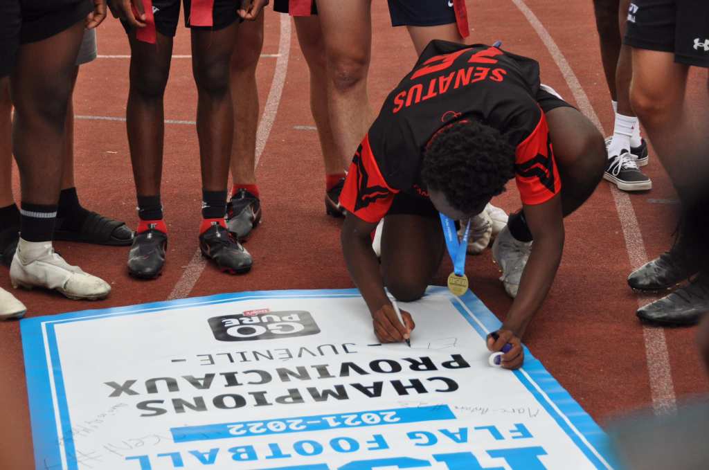 Une bannière à signer et à accrocher dans le gymnase de l’école pour la postérité. Une dernière raison de chanter, de danser et de se faire photographier ensemble, bras dessus, bras dessous. Des sourires francs, une fierté, mais aussi un sentiment du devoir accompli. Les gars l’ont fait ensemble. Ils ont gagné à leur manière, en étant heureux de fouler le terrain, avec confiance, en partageant leurs émotions et en se soutenant. Et ils l’ont fait malgré l’absence de deux receveurs de premier plan, Lauzon et le grand Delven Charles.