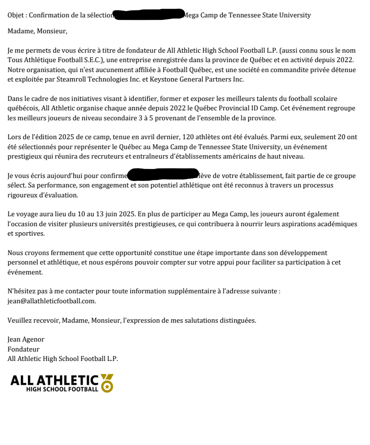 À noter, All Athletic High School Football est une société fondée par Jean Agenor dont le but est, selon les informations inscrites au Registre des entreprises du Québec, d’augmenter la visibilité des joueurs de football américain du Canada, et plus particulièrement du Québec, aux États-Unis pour qu’ils puissent obtenir des bourses d’étude. Très noble en soit. Qui ne voudrait pas avoir l’opportunité d’obtenir une bourse pour ÉTUDIER tout en pratiquant son sport favori face à la meilleure compétition possible?
